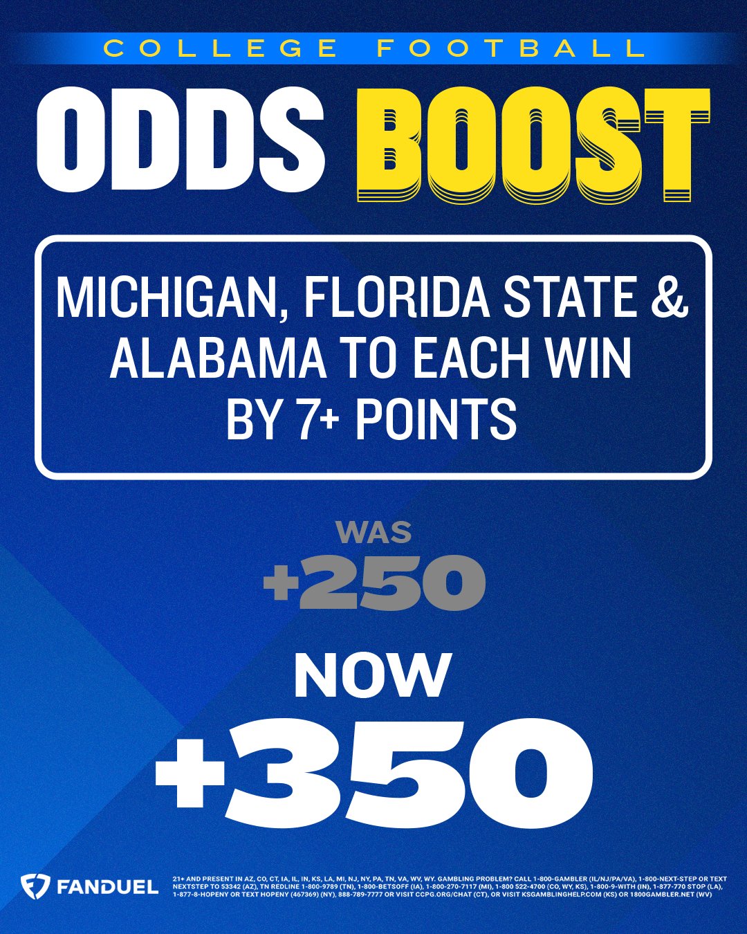 Fanduel Sportsbook On Twitter πΎππ½ ππΏπΏπ π½ππππ Michigan Florida State And Alabama To Each Win By 7 Points Today Was 250 Now 350 Bet It Here Https T Co Booy3bt479 Https T Co Asubqoqba7 Twitter